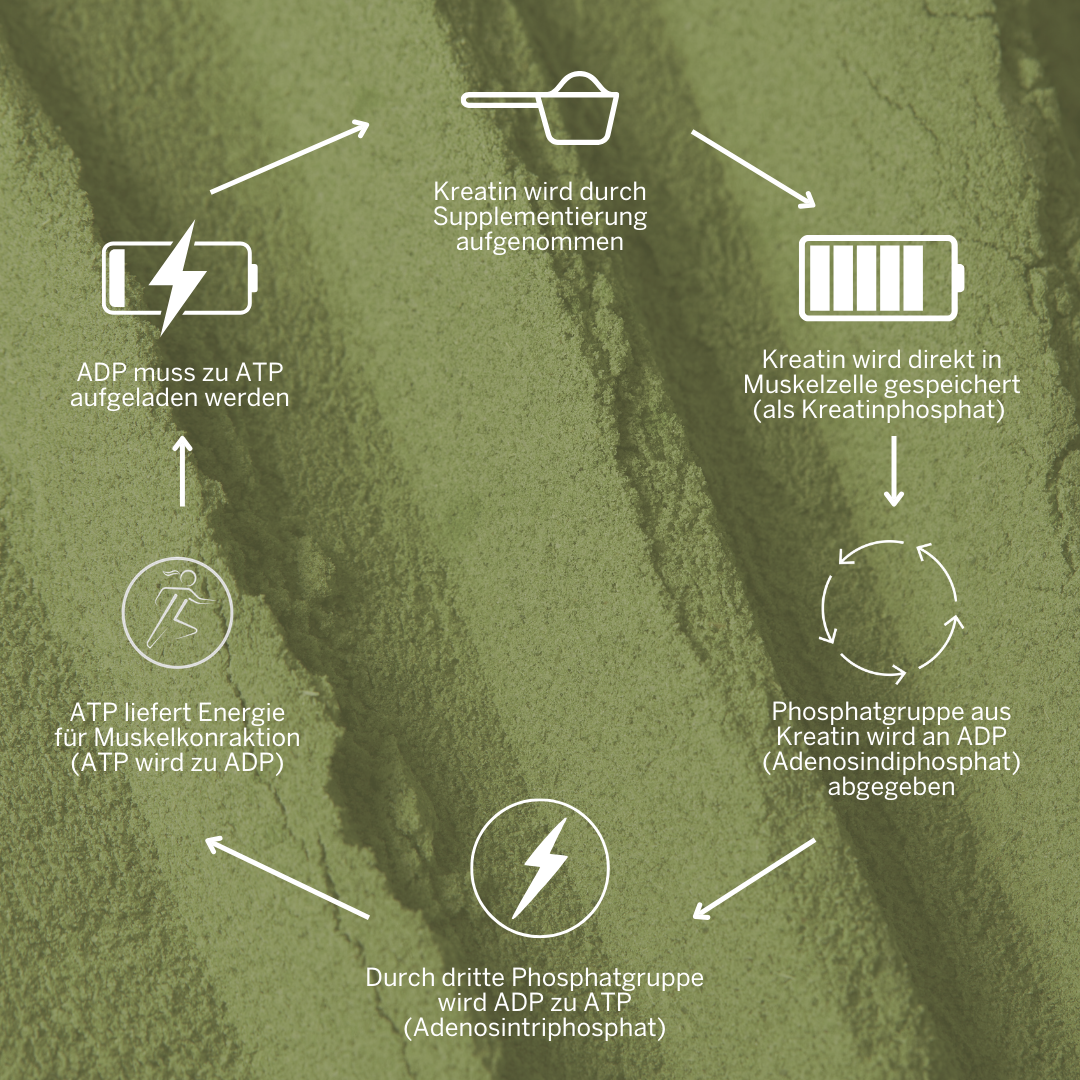 Kreatin spielt eine wichtige Rolle im Energiestoffwechsel der Zellen. Es ist an der schnellen Bereitstellung von Energie beteiligt, insbesondere in Muskelzellen bei intensiver körperlicher Belastung. Kreatin ist eine stickstoffhaltige Verbindung, die aus Aminosäuren gebildet wird und im Körper vor allem in der Muskulatur gespeichert wird. Dadurch unterstützt es die körperliche Leistungsfähigkeit bei kurzfristigen, intensiven Belastungen.